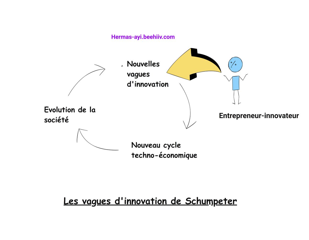 Schumpeter décide d’appeler tout ça des vagues d’innovation. Donc pour Schumpeter, ce n’est plus seulement la technologie qui change la société, ce sont des vagues d’innovations.
