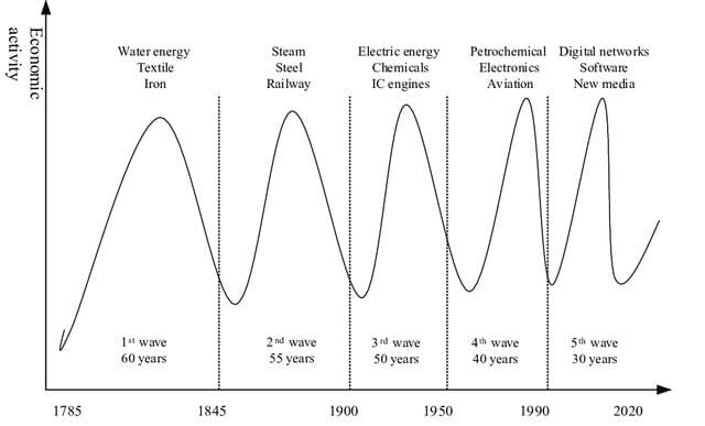 Il parle de « vagues », car pour lui, les changements qui provoquent les cycles de 40 à 60 ans ne surviennent pas de manière linéaire : ils arrivent par phase. L’innovation détruit l’ancien monde économique pour en faire émerger un nouveau. Il appelle cela : la destruction créatrice (creative destruction).